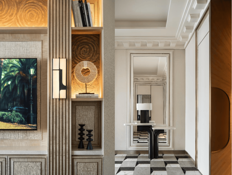 餐客厅尺度达到了惊人的16米,97m²,用一席壁炉做了视线分离,米色的洞石、自然冰裂纹的艺术漆。背景墙拱形胡桃木的静谧,地板拼花木格纹的精细,沙发钢琴键织布的韵律,营造的是回归生活本质的轻松写意。