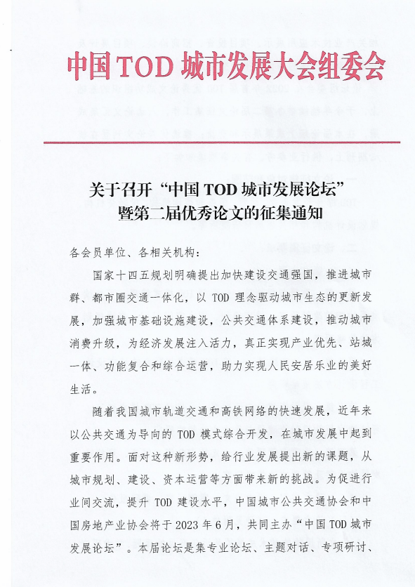 关于召开 “中国TOD城市发展论坛”暨第二届优秀论文的征集通知