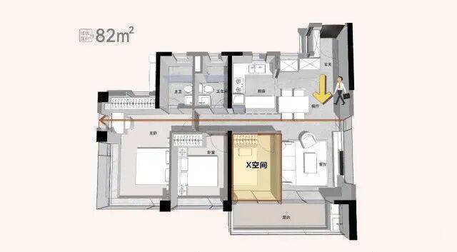 建面约108㎡户型,光是交付的大横厅,通过打通次卧,就能变身三面宽超级横厅,解锁接近20种生活方式表达。