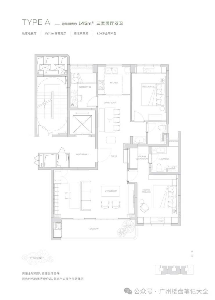 【主力户型】【145㎡户型】独享私家电梯厅-约7.2m²森幕宽厅-LDKB全明户型