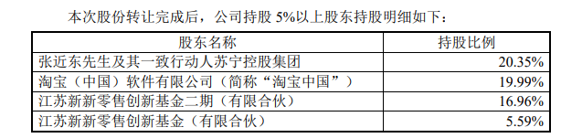 本次股份转让后,苏宁易购5%以上股东中,张近东及其一致行动人苏宁控股集团合计持股20.35%,淘宝中国持股19.99%,江苏新新零售基金二期持股16.96%,江苏新新零售创新基金持股5.59%。