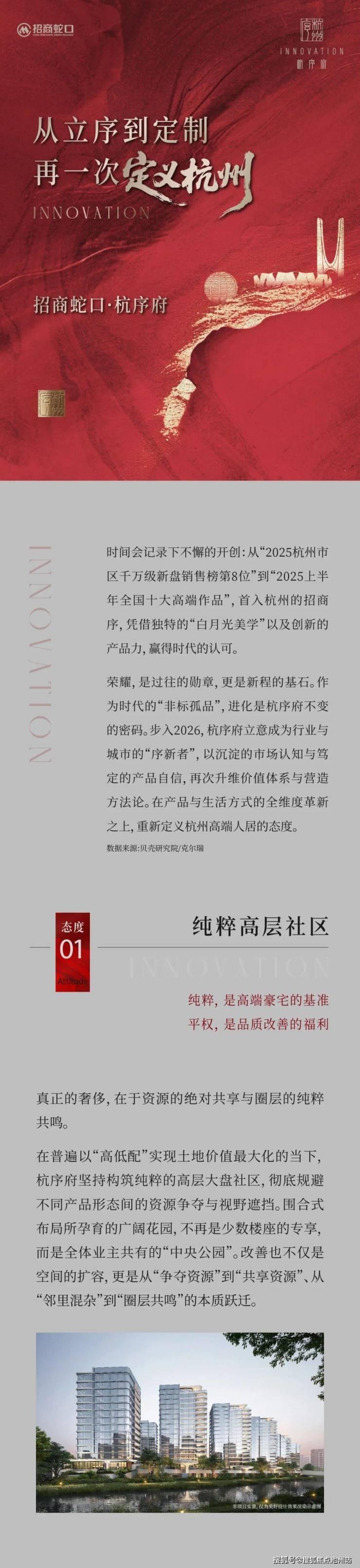 ▰▰ 杭州上城区 招商·杭序府 改善一步到位 ▰▰ 作为招商蛇口TOP序系落子杭州的2025年立新作品,招商杭序府秉承“非名城不启序、非核芯不立序、非大师不执序、非定制不著序、非创新不开序、非服务不传序”的六重严苛标准,为杭州时代领潮者开启人居革新序章。项目地处上城区钱江路与正谊路交叉口,是钱江新城二期新规一号作品,规划12栋13-16层精装高层,仅388席住宅,打造建面约170-370㎡的纯改善户型群落。