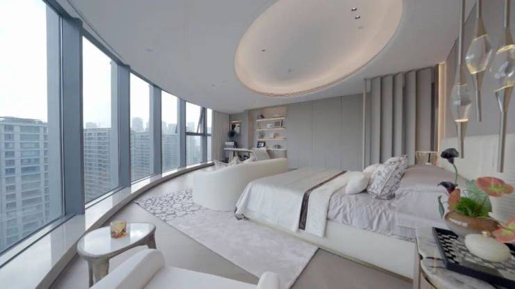 每层3个户型是呈“T”字形布局的,能够实现全部朝南、户户边套的采光、朝向的“平权”。每户都是270°流线形平面,超宽屏采光,拥有比矩形更大的入光面,就像是安藤忠雄理想中的“光之屋”照进了现实,空间的每一处都盈满自然光线。
