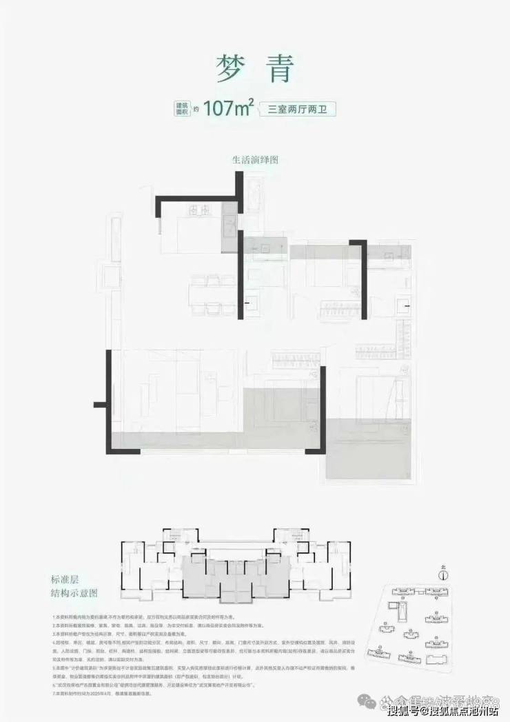 107㎡三房两厅两卫(梦青):此户型分布在1/2/3/6/7/8号楼的中间户型,北向常见连廊结构连接;三开间朝南、动静分区设计;户型整体呈现大开间小进深,即宽(开间)约11.1米,深(进深)约8.7米(前后有突出,此为综合深度);客厅开间约4.8米、客厅预留冰箱位置方便收纳;综合得房率约93%,不带花池露台,阳台连接主卧交付时统一封窗。