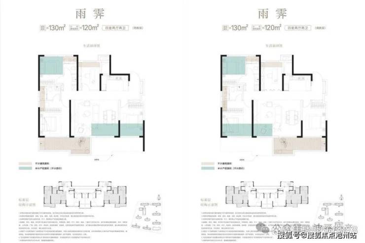 130㎡四房两厅两卫(雨霁):此户型分布在1/2/3/6/7/8号楼的东/西两端边户户型,户型整体呈现大开间小进深、即宽(开间)约12.8米,深(进深)约12.1米;三开间朝南、客厅开间约6米;奇偶层不同主要在南向主卧是否连接露台,露台部分无法封闭;综合得房率约97%。