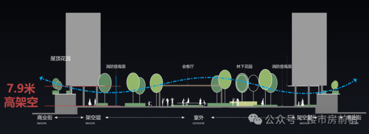 全域架空,即整个组团抬升7.9米,在构建防潮缓冲带的同时,还能起到防尘的作用。