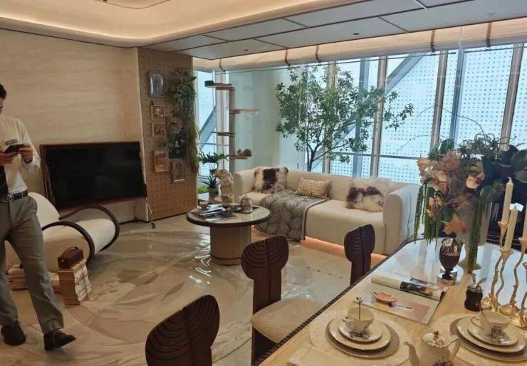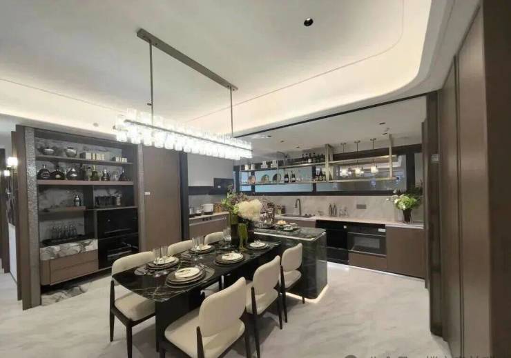 举个例子,其LDKB面积超过60平,中间没有一堵墙隔断,如果不使用成套沙发和多人圆桌,甚至会压不住迎面而来的奢阔感。