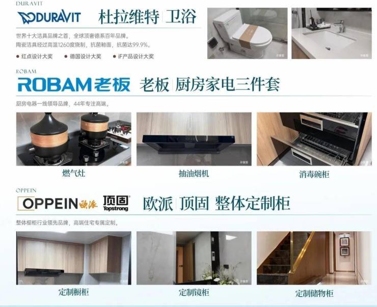 交付标准为全屋精装修,装修配置包含一线品牌产品:厨房采用老板或方太套装,卫浴选用德国一线品牌洁具,开关面板为西门子系列,同时配备厨卫防溅水插座与品牌定制橱柜。