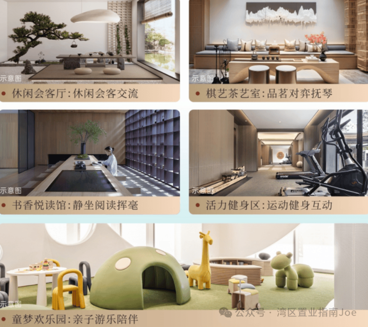 社区内部规划了现代禅意风格园林,包含 400 米环形健康漫步道与 12 大主题景观,同时设置五大主题架空层,分别为活力健身区、休闲会客厅、棋艺茶艺室、书香悦读馆与童梦欢乐园,覆盖不同年龄段居民的休闲需求。