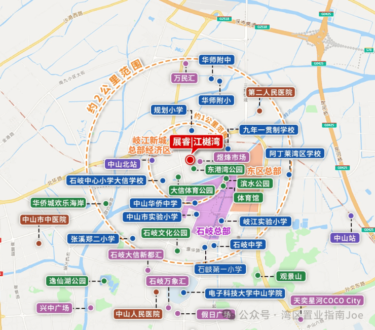 临近中山欢乐海岸主题乐园(约 1500 米),同时可快速抵达天奕星河 COCO City、石岐大信、石岐万象汇等成熟商圈,满足购物、娱乐需求。医疗资源方面,周边有中山市人民医院、中山市中医院两所三甲医院,以及苏华赞医院等市级医疗设施,为居民健康提供保障。