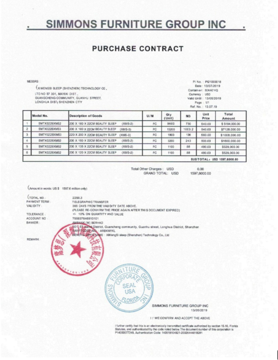 该次涉及产品为出口定制类beautysleep系列产品,数量3万张,单价约540美元,涉及总金额过亿元。经过内部讨论,席梦思床垫中国工厂负责人决定不向美国贸易打压屈服,缴纳高额的税率,转而将出口产品让利供应给国内大众,让大家更加轻松地享受到高品质产品。