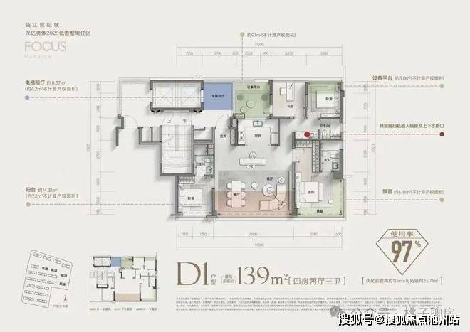 先看建面约139㎡四房三卫户型。LDKB的户型设计;封包阳台+主卧L型飘窗;双套卧、三卫;南向超大开间;专梯专户、尊享电梯前厅...