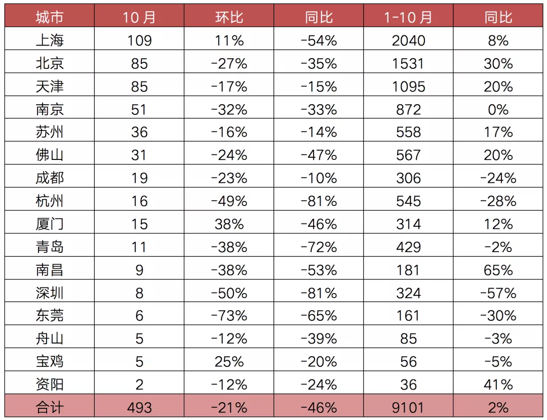 行业调控持续下,政策以及监管在窗口指导方面对各个融资方式加大审查力度,同时受行业多企业出现债务违约影响,房企当前融资较为困难,10月100家典型房企的融资总量为367.35亿元,环比下降54.5%,同比下降71.3%,融资量达到历年来新低。至此自2020年11月份以来,房企的单月融资连续12个月均呈现同比下降。