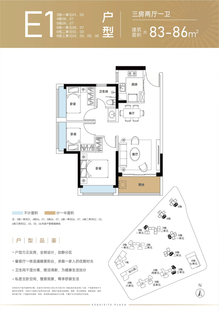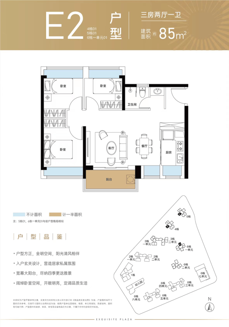 85㎡的3房2厅1卫(E2),得房率:72.95%(不含赠送),阳台主朝东南或西南向看小区园林。