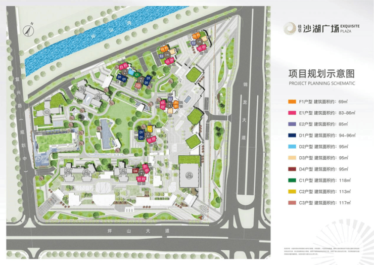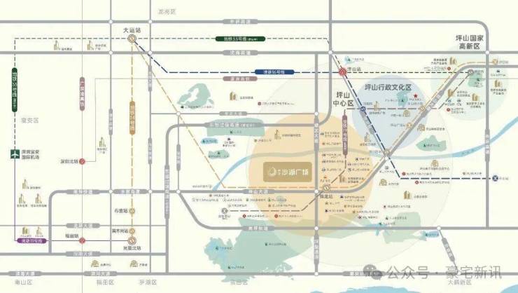 佳华沙湖广场项目位于坪山区坪山大道与锦龙大道交汇处西北角(在建14号线锦龙站旁),项目是包含商业、办公/公寓、住宅、幼儿园于一体的大型综合体,总建面超62万㎡。隔壁是深业国际东城、力高君御国际等住宅区。