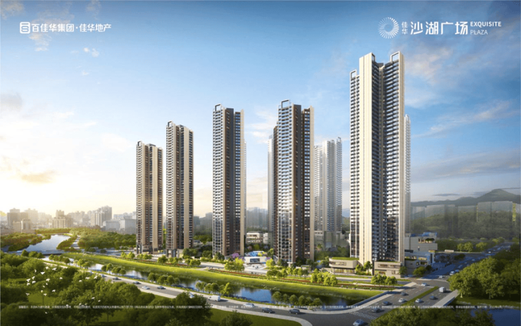佳华沙湖广场,由佳华集团操盘,总占地面积约8.17万㎡,总建筑面积约62.2万㎡,计容建筑面积约42.6万㎡,容积率5.21,绿化率30%,共由6栋14个单元总高44-52F的住宅组成,其中1栋回迁房52F,2栋1/2单元回迁房50F,3栋1/2单元商品房50F,4栋商品房49F,5栋商品房44F,6栋1/3单元商品房46F,6栋2单元商品房47F,6栋4/5/6单元回迁房46F,6栋7单元办公+商务公寓45F,7栋规划1所幼儿园。