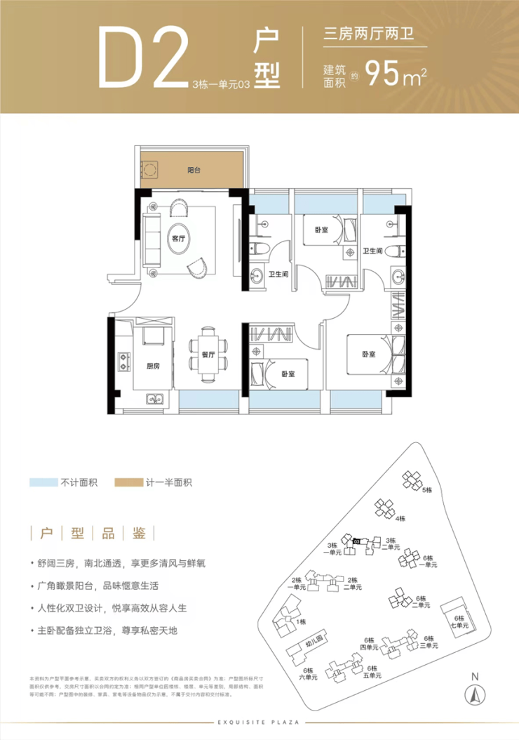 95㎡的3房2厅2卫(D3),得房率:72.95%(不含赠送),阳台主朝东南或西南朝向。