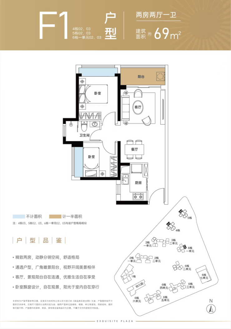 69㎡的2房2厅1卫,得房率:72.94%(不含赠送),西北向看坪山河景观或东北朝向面向锦龙大道。