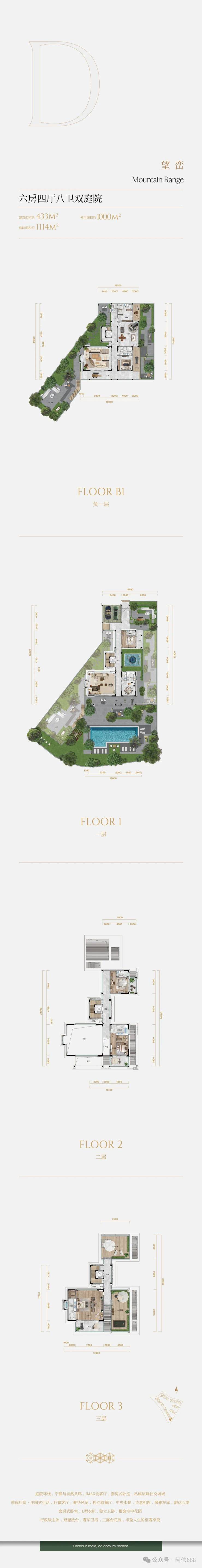 「山海之间 千平大院 独栋别墅」建面约344-445㎡独栋,千平大院的传世藏品①超低密规制,约0.3容积率②层层阔绰花园,无界度假风情③行政级主卧,奢华规制私密静逸