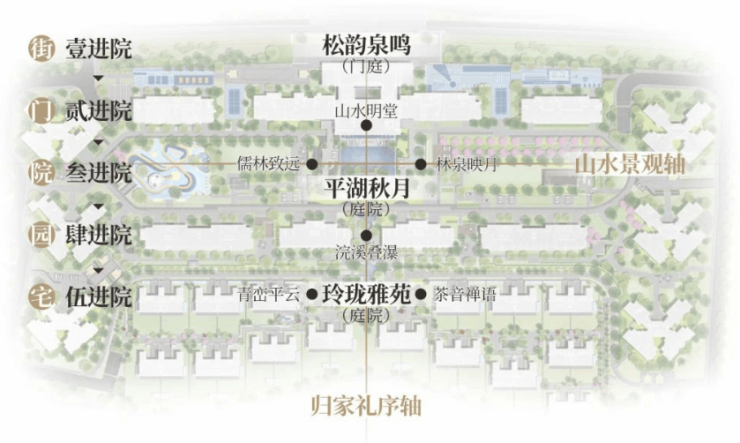 汲取岭南四大名园精华,布局两轴三庭,五进六园,尽显归家礼序。
