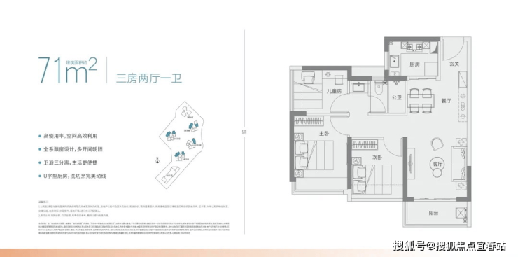 71㎡的3房2厅1卫,设计的是竖厅格局,餐客厅一体化,动静分区,客厅3.1米开间,3个卧室分别做到了主卧10.64㎡/次卧7.83㎡/次卧7.56㎡(包含墙体飘窗),U型厨房,卫生间三段式分离设计,得房率:78.19%(不含赠送),阳台进深1.25米,有东北或西北向。
