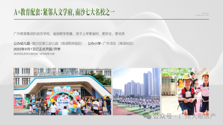楼下即是顶级名校广州外国语集团旗下滨海实验学校南校区(南北校区、九年制)以及南沙第三幼儿园(海语熙岸园区);