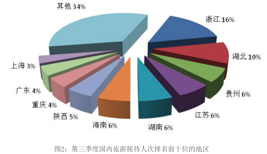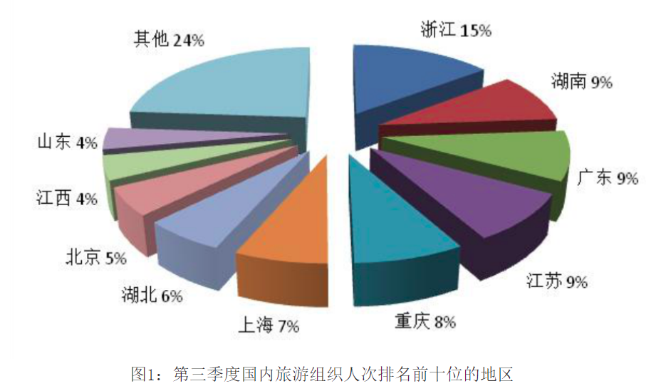 报告还显示,第三季度旅行社国内旅游组织人次排名前十位的地区由高到低依次为浙江、湖南、广东、江苏、重庆、上海、湖北、北京、江西、山东。