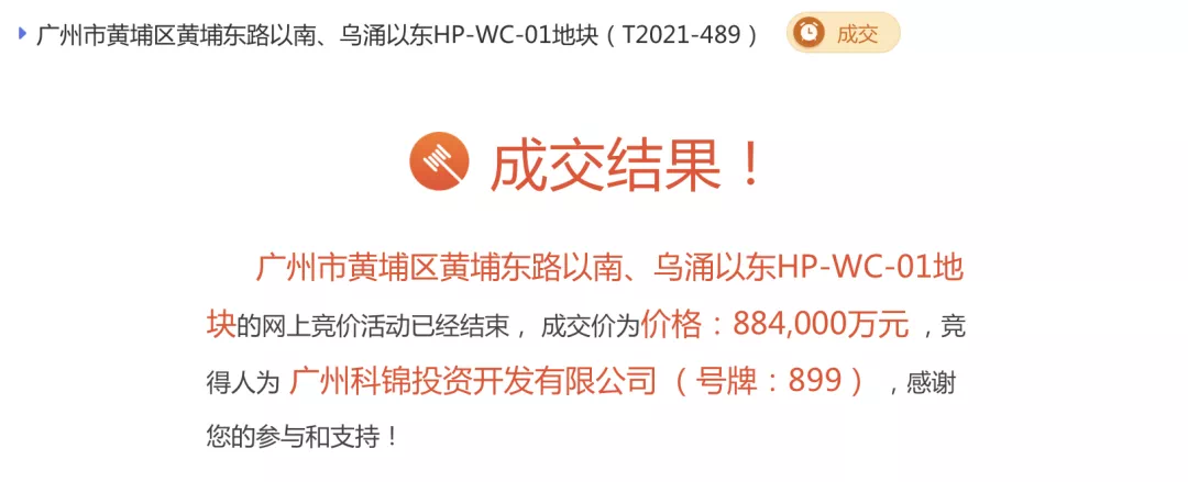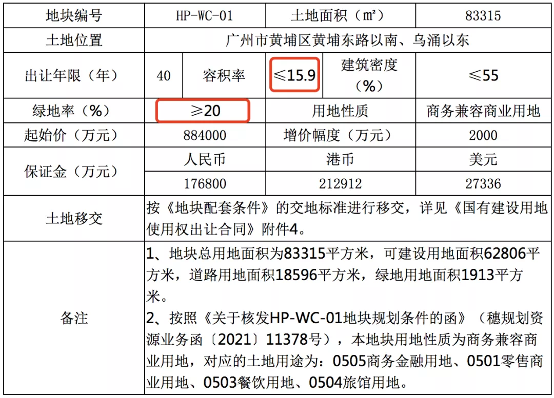 黄埔区HP-WC-01地块被广州科锦投资开发有限公司以88.4亿底价拿下,折合楼面价约6697元/㎡。该地块总用地面积83315㎡,可建设用地面积62806㎡,容积率≦15.9,总计容建面1000000㎡。
