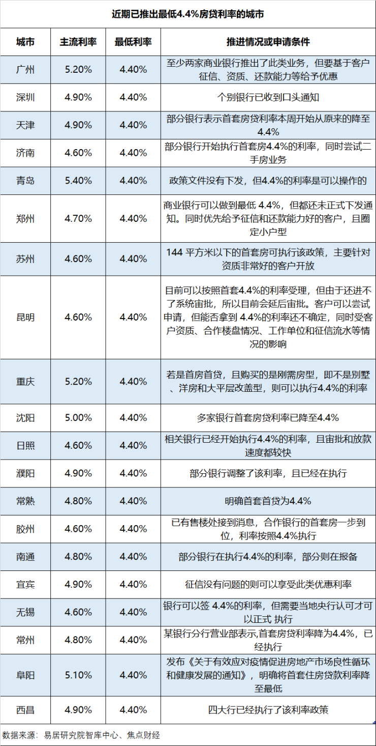 广州、深圳、天津、济南、青岛、郑州等20个城市均出现了4.4%的房贷利率。