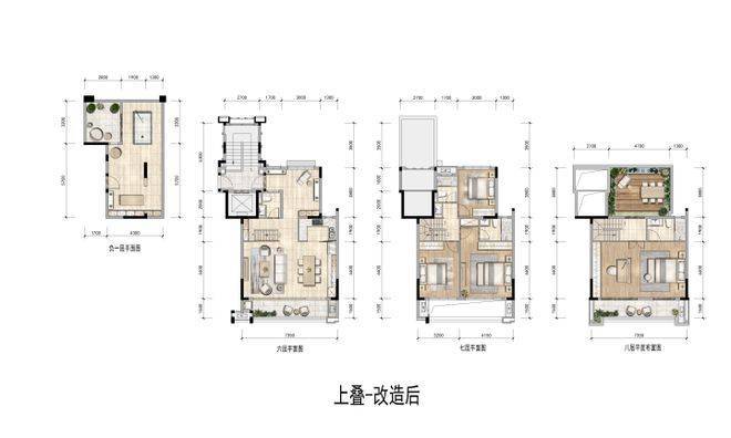 六层餐客厅厨房,七层是休息区共有3间卧室,八层整一层南北通透的大主卧,北有露台南有阳台。