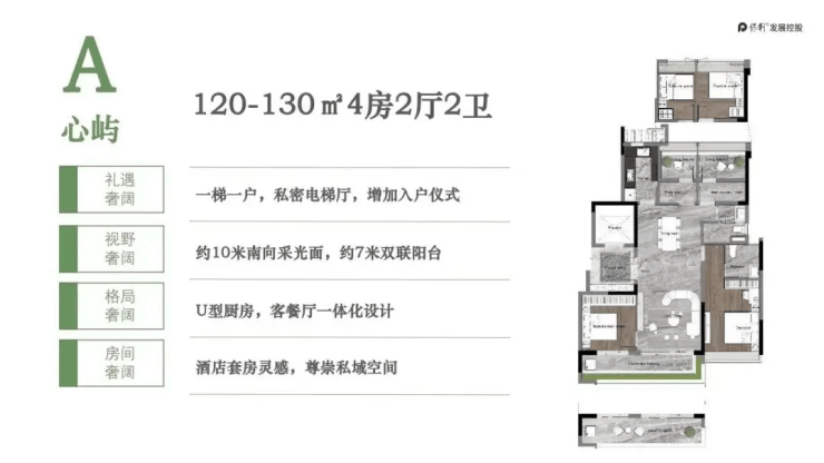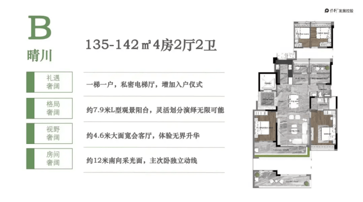 142㎡四房是热门户型,南北双阳台布局,生活阳台3.2米、景观阳台6.8米,实现空气对流