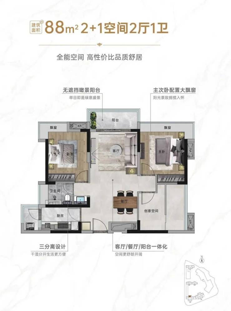 如果是首套置业,可以看看建面约88㎡2+1房。