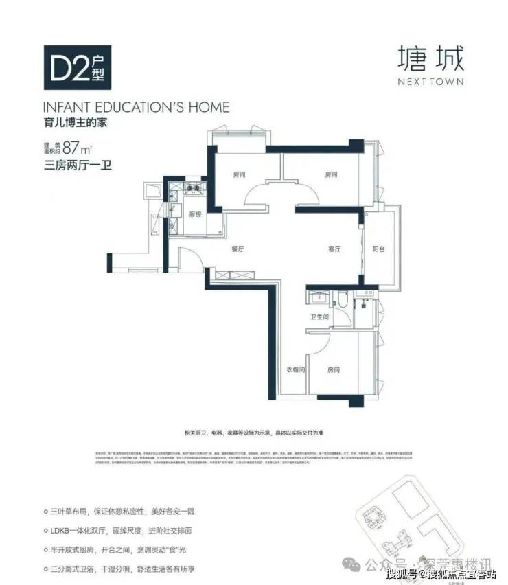 87㎡的3房2厅1卫,D2户型,5栋4/5单元03户型,设计的是竖厅三叶草格局,进门入户玄关,客厅3.3米开间,得房率约80%(包含赠送),东北或西南朝向。