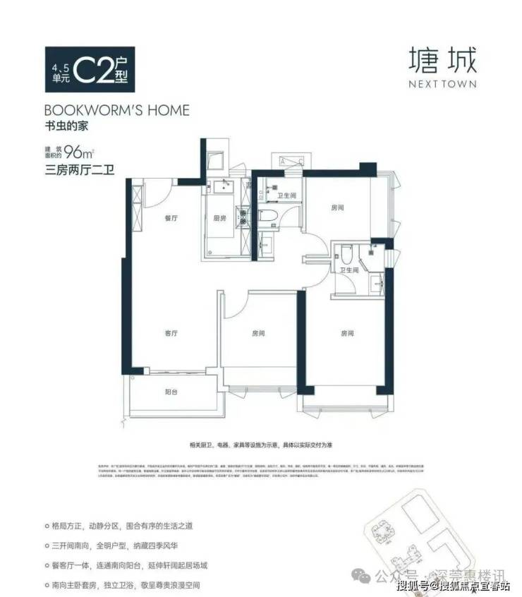 96㎡的3房2厅2卫,C2户型,5栋4/5单元02户型,设计的是竖厅格局,进门入户玄关,客厅3.3米开间,三开间朝南,得房率约80%(包含赠送),东北或西南朝向。