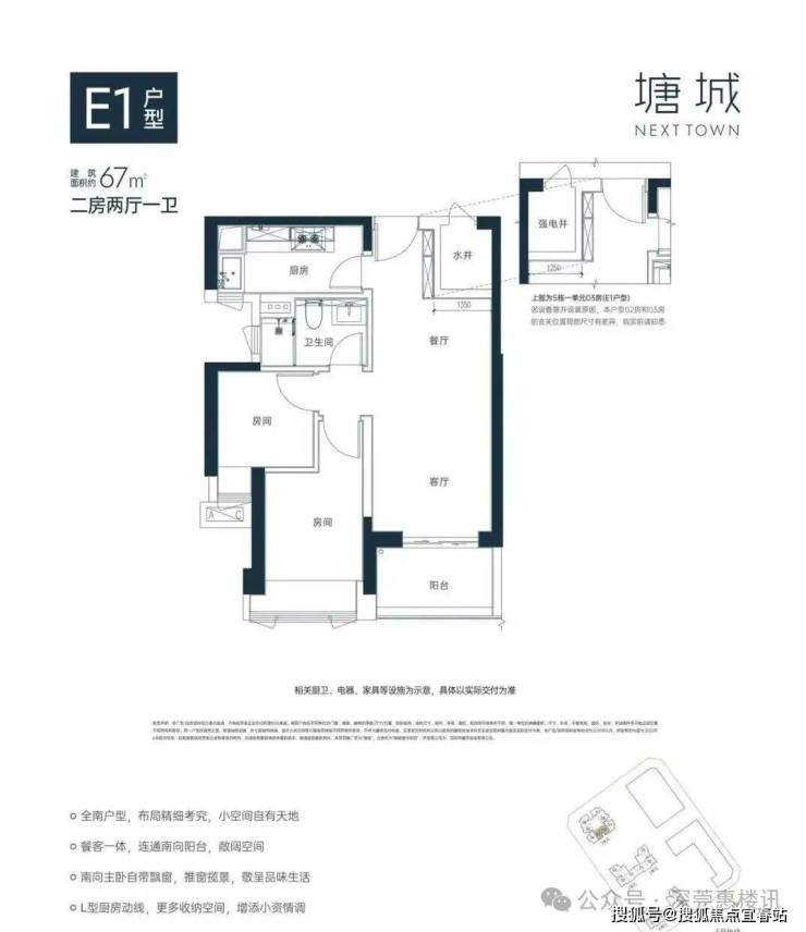 67㎡的2房2厅1卫,E1户型,5栋1单元02/03户型,设计的是竖厅格局,客厅3.15米开间,得房率约80%(包含赠送),东南朝向。