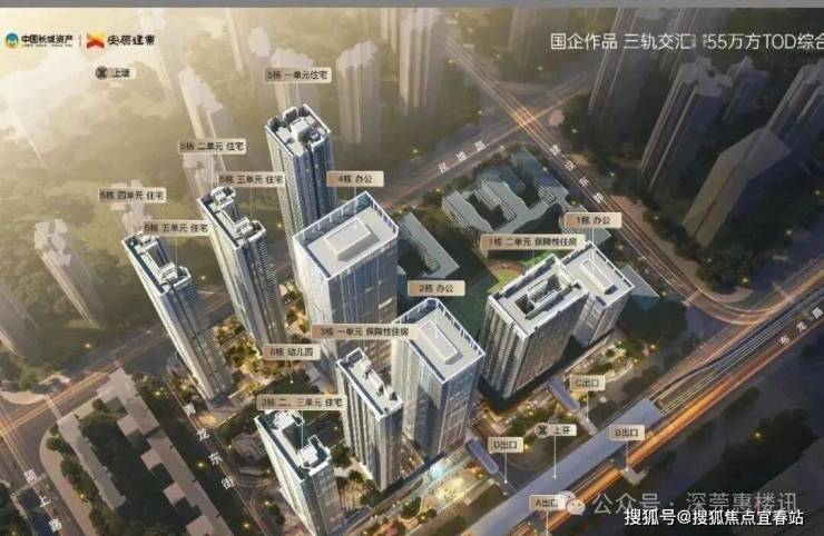 根据公示规划,项目由4栋45F超高层住宅、3栋40F、30F写字楼、1栋45F保障房、1栋3F幼儿园以及一所九年制学校组成,未来将建设成为集住宅、办公商业为一体近40万㎡的TOD城市商住综合体项目。