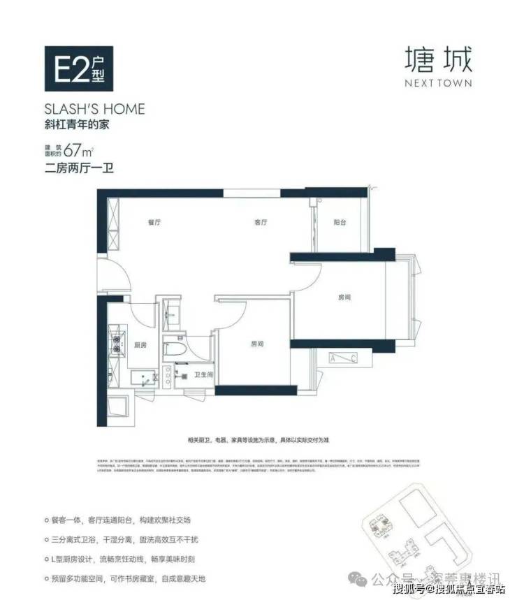 67㎡的2房2厅1卫,E2户型,5栋1单元05/08户型,设计的是竖厅格局,客厅3.15米开间,得房率约80%(包含赠送),东北或西南朝向。