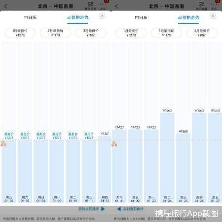出行需求的释放反映在机票价格方面,北京商报记者从携程旅行App看到,1月北京飞往香港的机票最低价位为1273元,春节期间机票价格有小幅波动。1月8日北京飞往香港的机票票价为1273元,春节期间1月24日的票价为1663元,上涨幅度超30%。