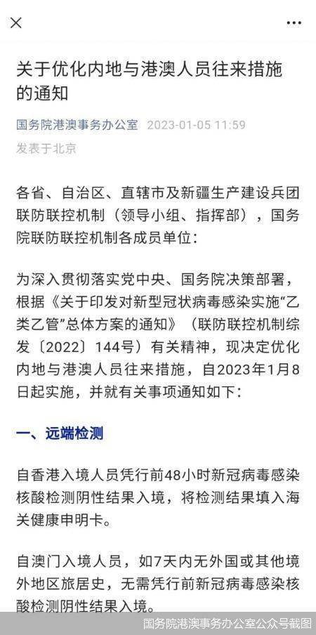 根据《通知》,自香港入境人员凭行前48小时新冠病毒感染核酸检测阴性结果入境,将检测结果填入海关健康申明卡。自澳门入境人员,如7天内无外国或其他境外地区旅居史,无需凭行前新冠病毒感染核酸检测阴性结果入境。同时,恢复办理内地居民旅游、商务赴香港签注。