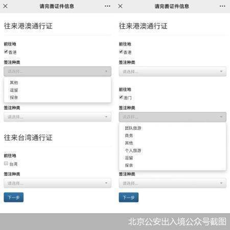 北京商报记者登录北京公安出入境官方微信公众号看到,内地居民出入境预约来往港澳通行证方面,前往香港的签注种类目前仍仅有其他、逗留以及探亲,但在前往澳门的签注种类中则包含团队旅游、商务、个人旅游等。