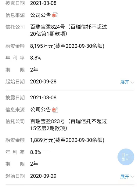 焦点财经发现,信托融资、永续债、股权质押、明股实债等多种方式成为蓝光发展规模突围“富贵险中求”的捷径。其中,在信托融资方面,据不完全统计,今年3月披露的信托融资中,百瑞宝盈824号融资金额为8195万元(截至2020年9月30日),年利率为8.8%,百瑞宝盈823号融资金额我为1889万元,年利率同样为8.8%。