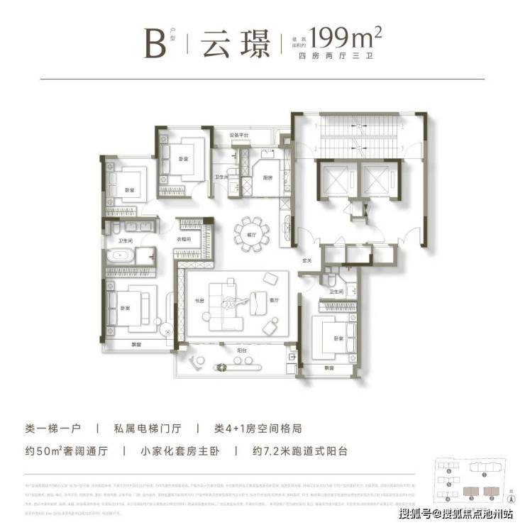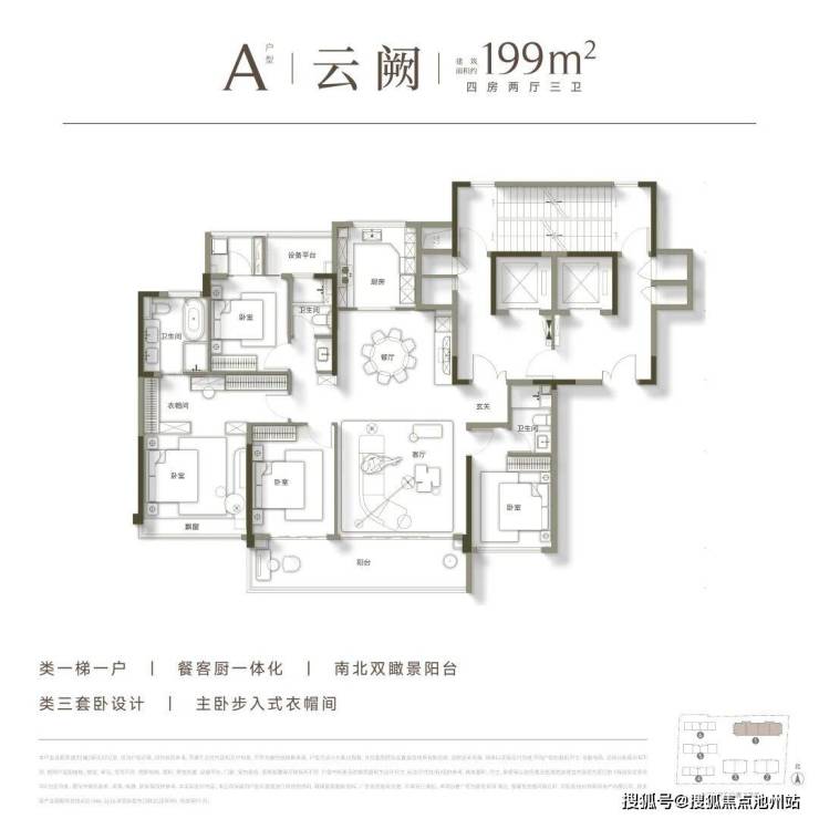 高层建面约199方,有A、B两款,四房两厅三卫双套房格局,南北通透、类独门独户、南向奢阔瞰景阳台。