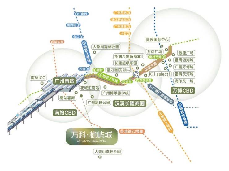 万科檐屿城雄踞广州南站CBD核心区,占据“珠江新城-南站万博CBD”双中轴交汇点,是广州“东进南拓”战略下的核心发展极。项目位于番禺黄金8公里范围内,串联万博、长隆两大世界级商圈,汇聚番禺70%的经济总量与常住人口,形成“超级枢纽+超级商圈”的复合价值。作为南站板块封面作品,项目坐享南站3.0升级红利,依托15轨湾区枢纽(5高铁+6城轨+4地铁),15分钟直达琶洲、30分钟连通珠江新城,1小时畅达湾区核心城市,4小时覆盖华南各省,8小时通达全国,是广州南拓的“黄金动脉”与大湾区交通心脏。