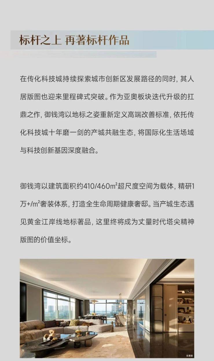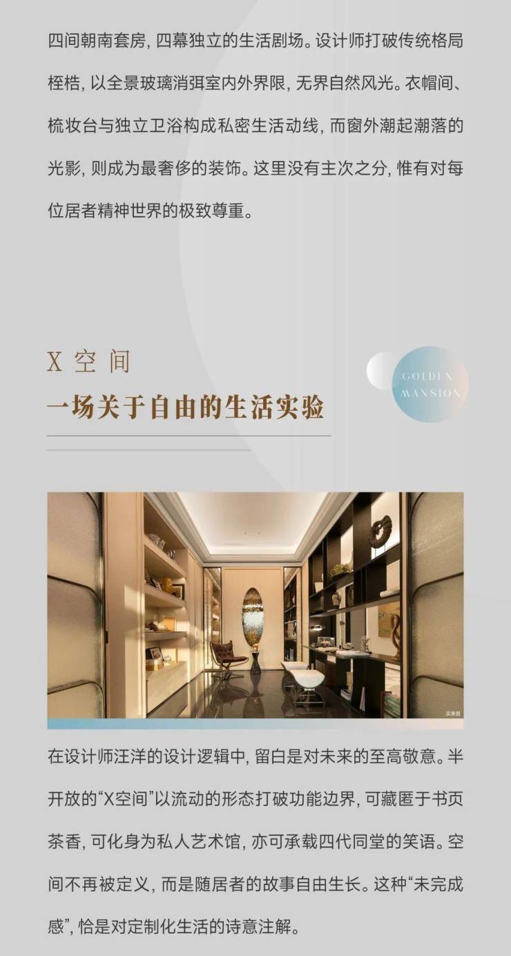 珍贵的土地,值得涵养高贵的生活。在建筑面积约460㎡[领潮]与建筑面积约410㎡[湾潮]样板中,大师设计精琢奢华的本象,在层高4米的朗阔场域中,打造270°巨幕观江视野,超大LDK家庭社交中心,为未来居者盛载流动且美好的生活情境。