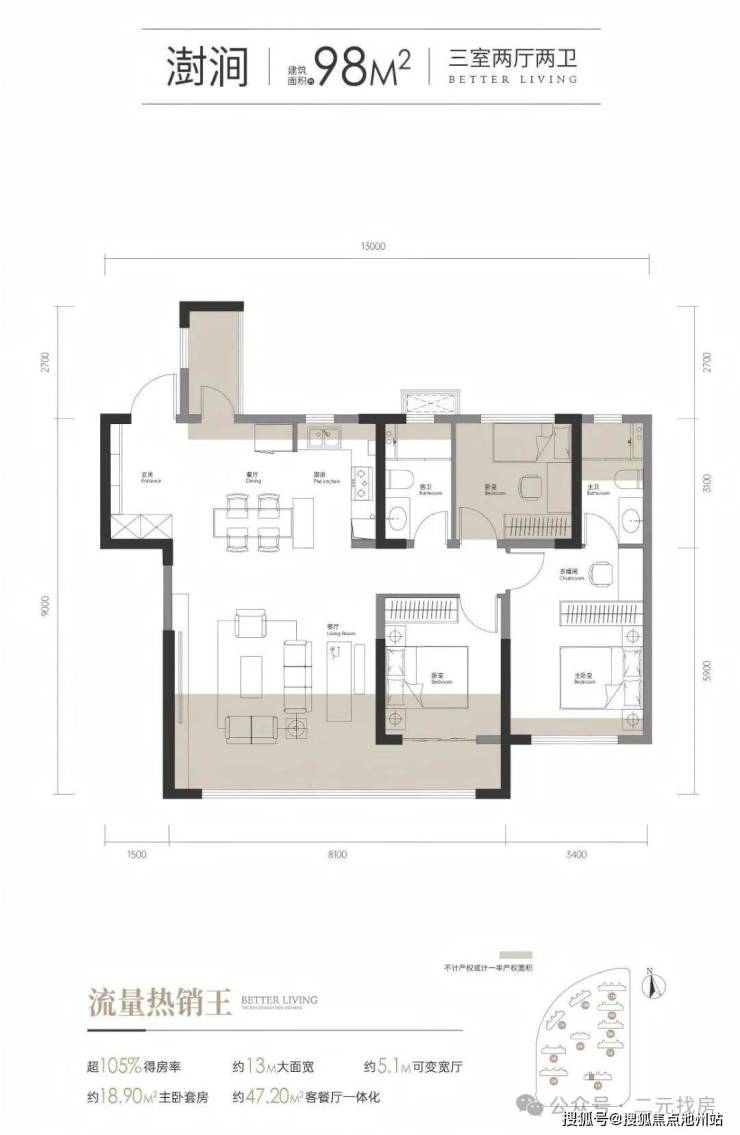 从设计上来看,同样的三开间朝南,11.5米的南向大面宽,客厅开间5.1米,朝北次卧、厨房处的小阳台也做了半赠送。
