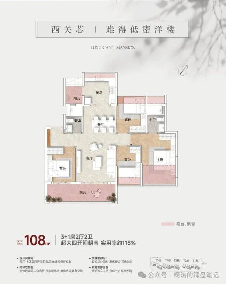整个项目有5栋10层南向板楼,三个户型分别是98平、108平和156平,全四房设计。