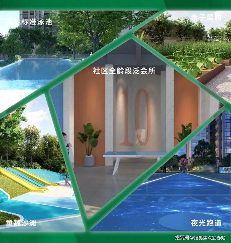 社区全龄段泛会所、国际标准泳池、夜光跑道、亲子菜园、童趣沙滩等