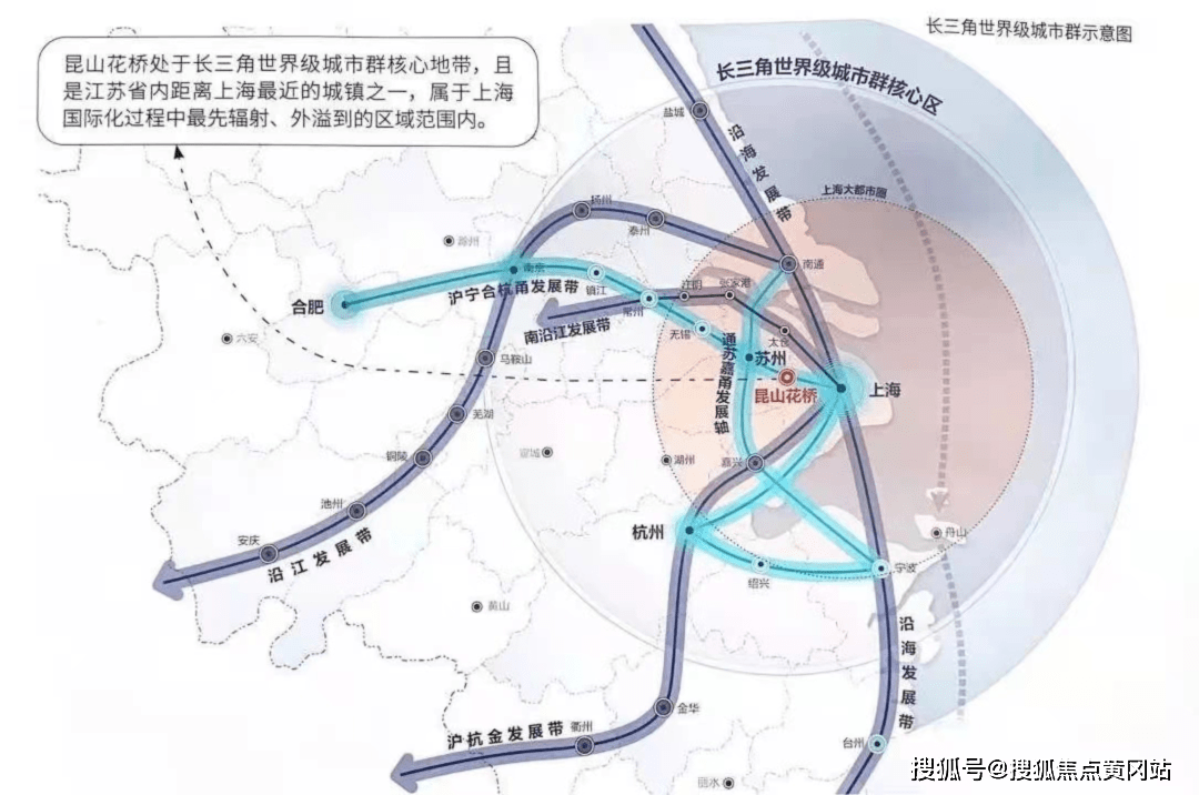 2021年2月,在国务院批复的虹桥国际开放枢纽“一核两带”功能布局中,昆山被纳入以虹桥商务区为起点延伸的北向拓展带。