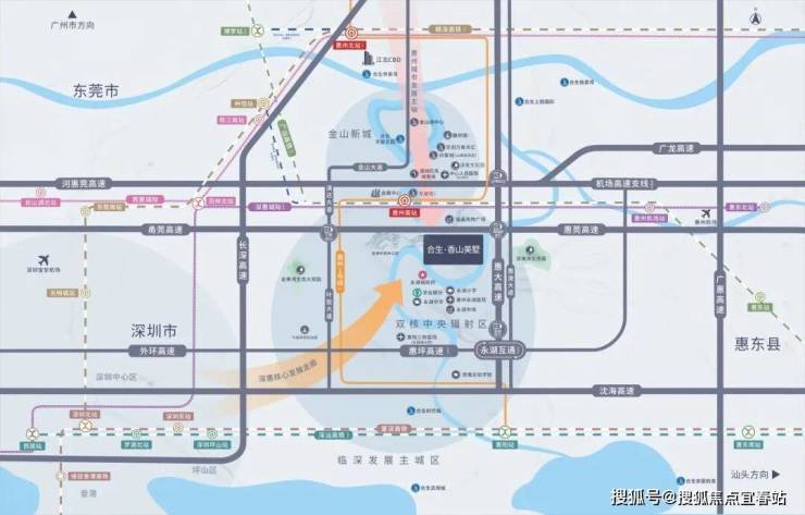 区域价值;金山新城南,1小时深圳都市圈惠州是粤港澳大湾区东部枢纽门户,也是湾区的生态担当,根据广东省十四五规划,惠州全区域纳入深圳都市圈。金山新城将打造成为惠州未来城市中心和生态城市样板核心,规划有新会展中心、惠州塔、惠州眼等众多城市地标,未来片区人口规模将达75万人。有着与深圳湾相似的区域基因,作为城市后起之秀,却有赶超江北CBD的趋势,未来价值不可估量。交通配套;经叶挺大道(丰字交通纵轴)约10分钟抵达金山湖中心商圈,约半小时可通达包含江北华贸在内的众多繁华商圈。该道路也是城市发展主轴,是惠州南北连接的重要交通命脉。且惠州机场疏港快线经过我们项目,该快线建成通车后,将会成为地区东西向重要的干线大动脉,同样也是东莞市以及沿线各镇区通往惠州机场的快速通道之一。