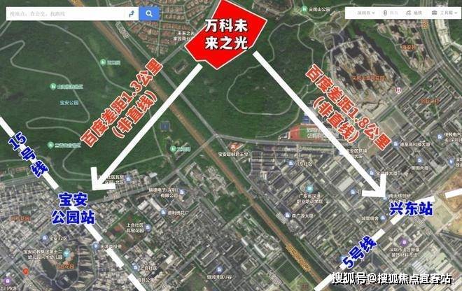 项目周边邻近京港澳高速、南光高速、南坪快速等交通主干道,当下距离最近的是5号地铁线“兴东站”约1.8公里,楼下后期有公交首末站接驳到地铁站约20分钟,规划在建的15号地铁线“宝安公园站”距离约1.3公里。